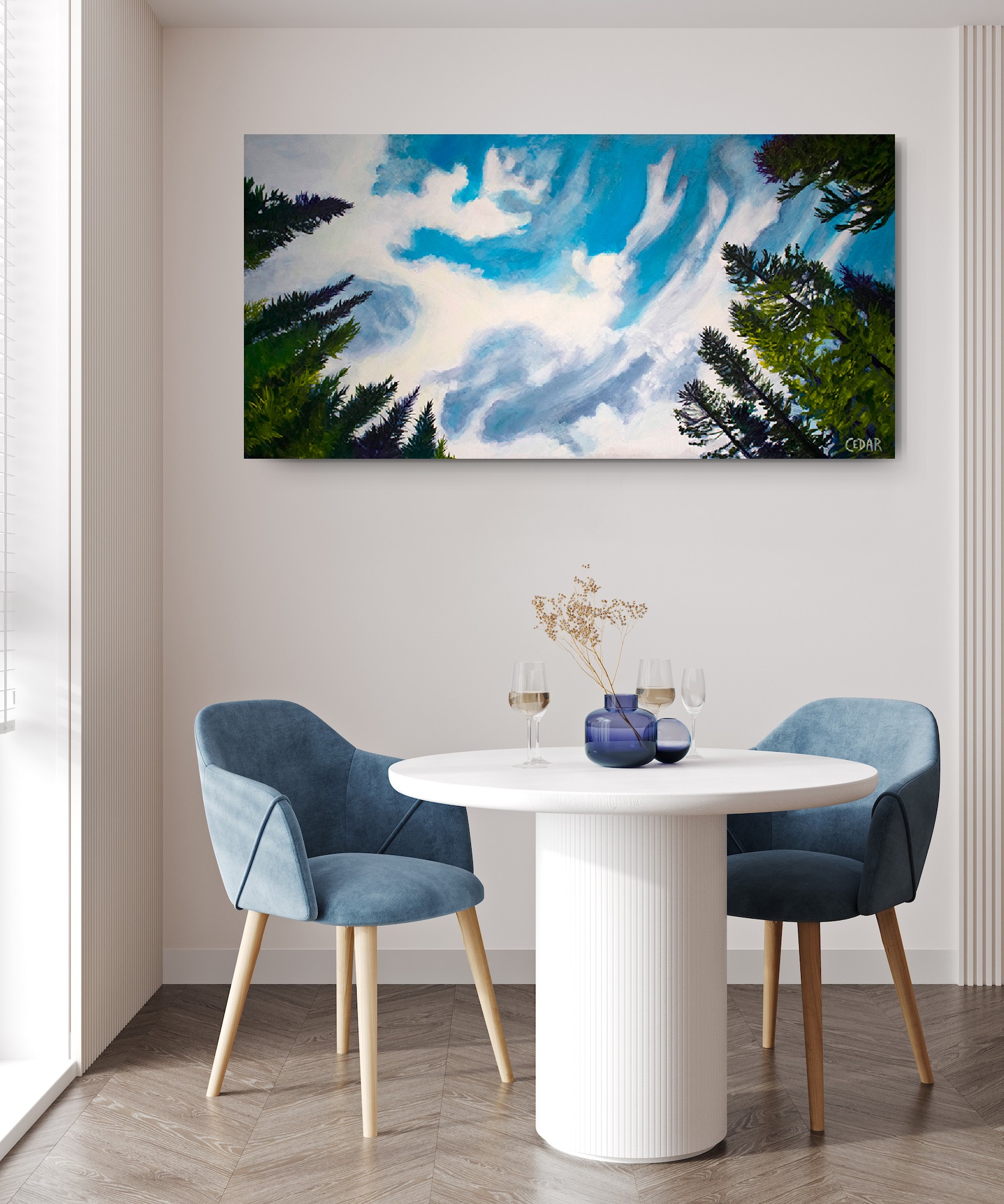 Painting by Cedar Lee of clouds floating in a blue sky over evergreen trees.Change is the Change is the Only Constant. 24″ x 48″, Acrylic on Canvas, © 2020 Cedar Lee