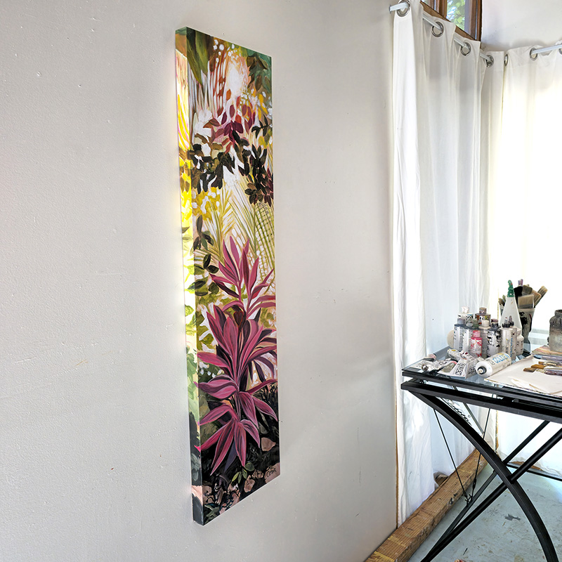 This painting is 48″ x 12″, acrylic on a wood panel, and it’s called Jungle in Pink.