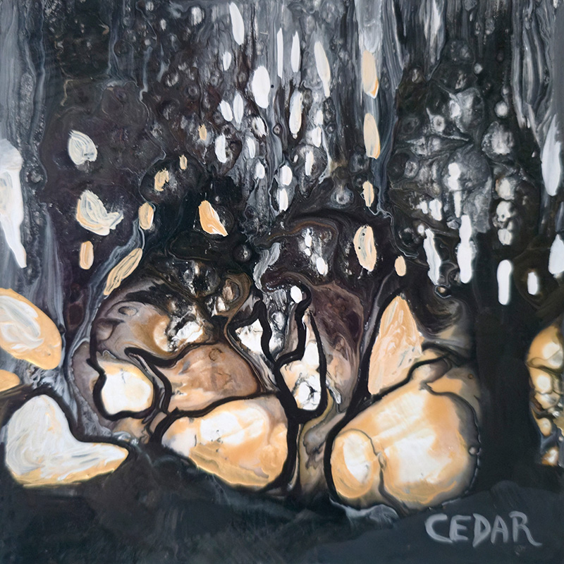 Metallic Trees 10, heavy on the black, is a moody painting.