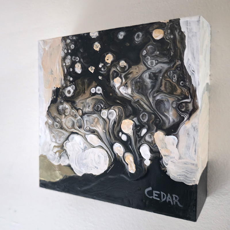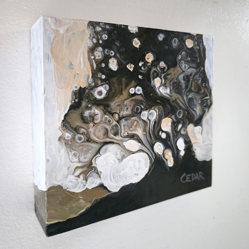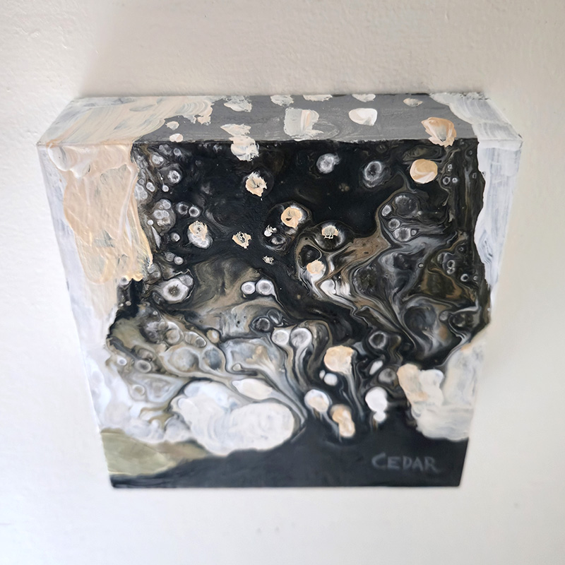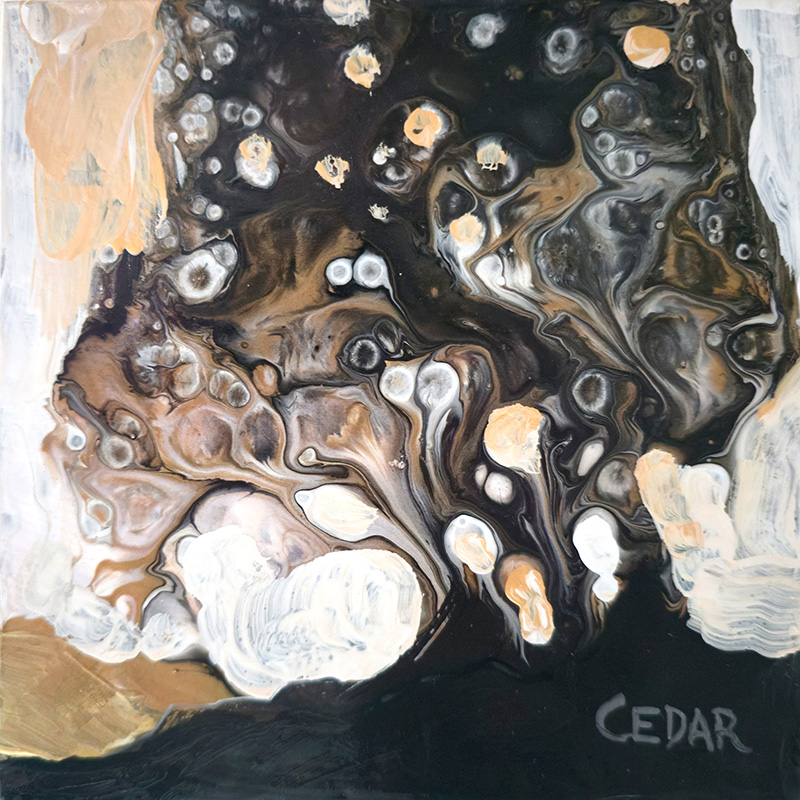The interesting bloom-like spots in the foliage of the trees continue over the top edge.