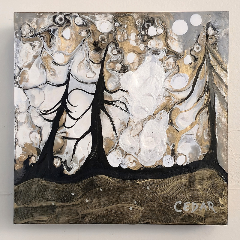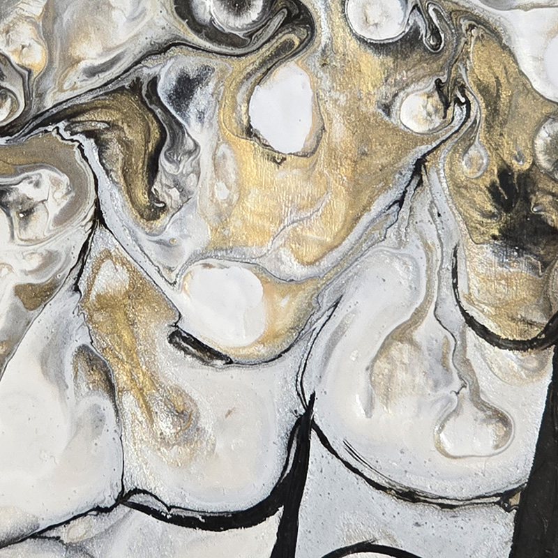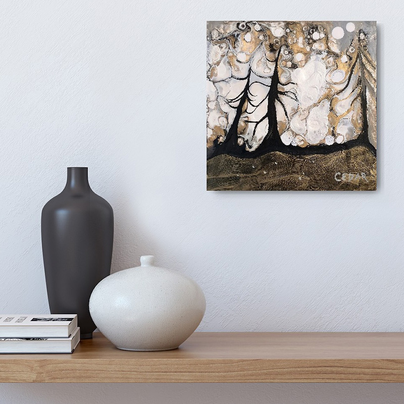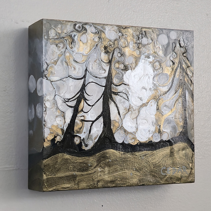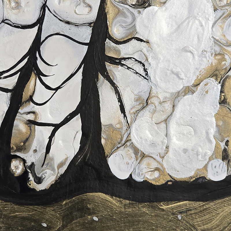 This painting, “Metallic Trees 2,” combines acrylic paint pouring techniques alongside intentional brushwork to highlight the interesting forms of tree branches and roots inherent in the randomness of the poured paint.