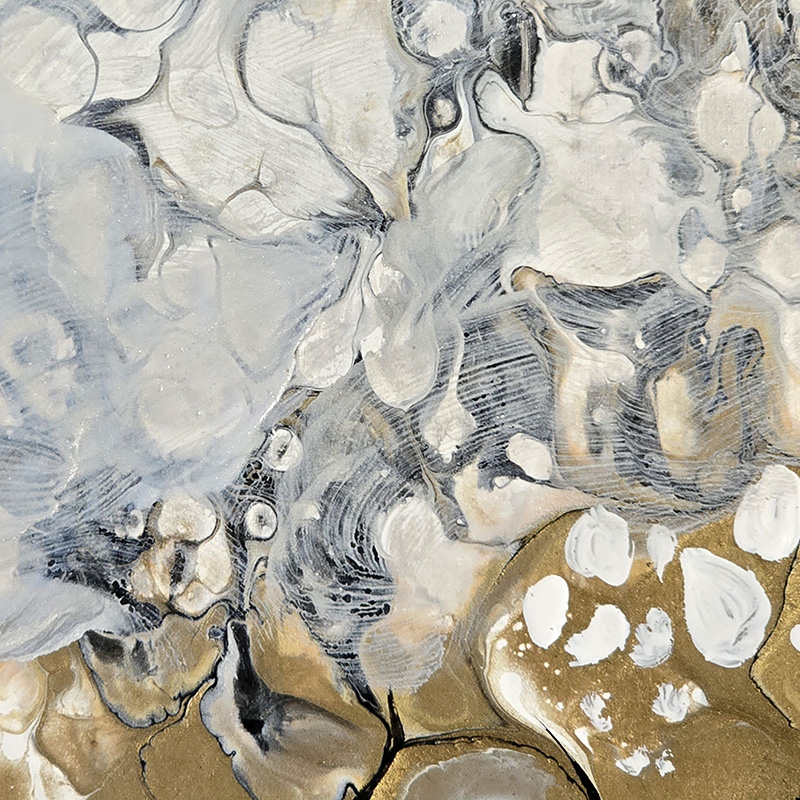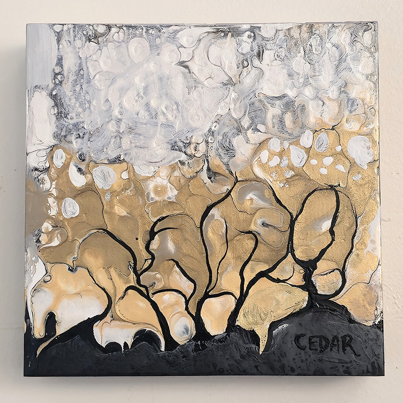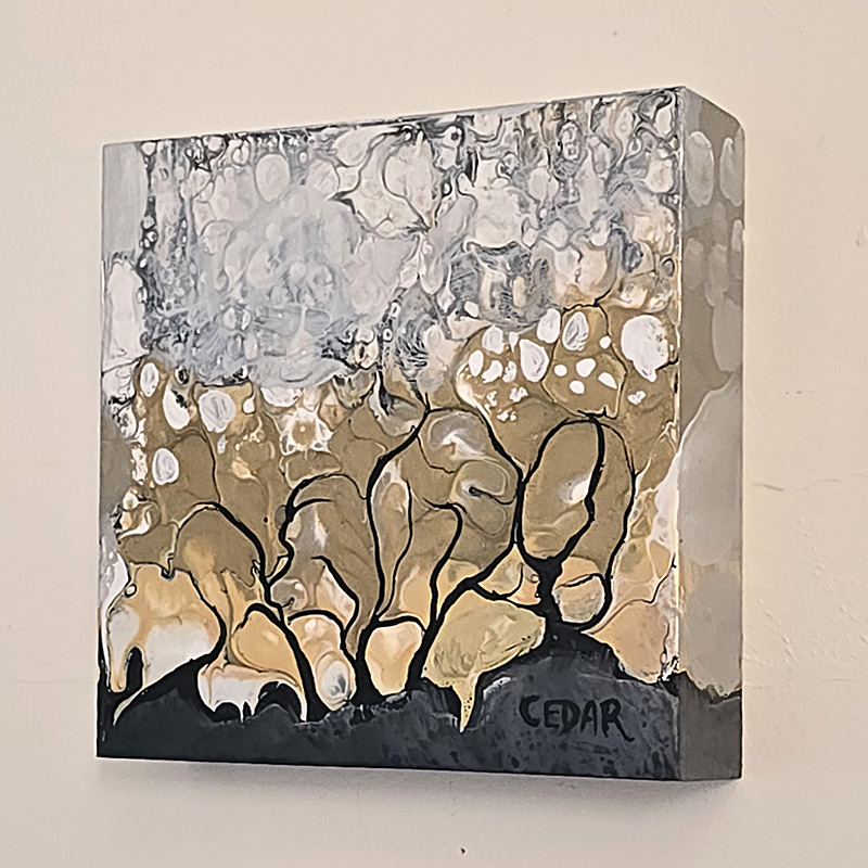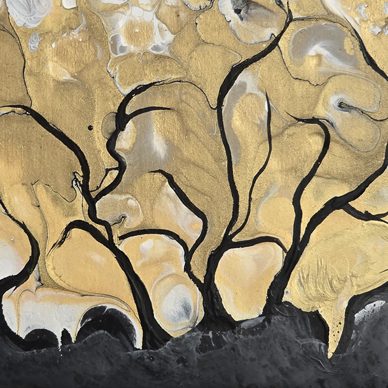 This painting, “Metallic Trees 3,” combines acrylic paint pouring techniques alongside intentional brushwork to highlight the interesting forms of tree branches and roots inherent in the randomness of the poured paint.