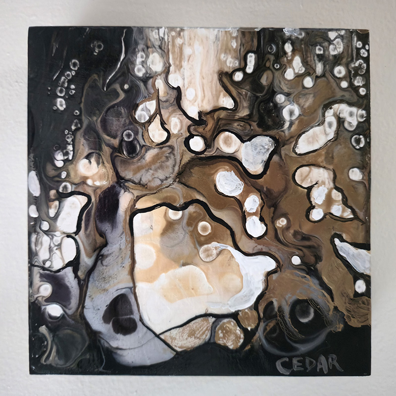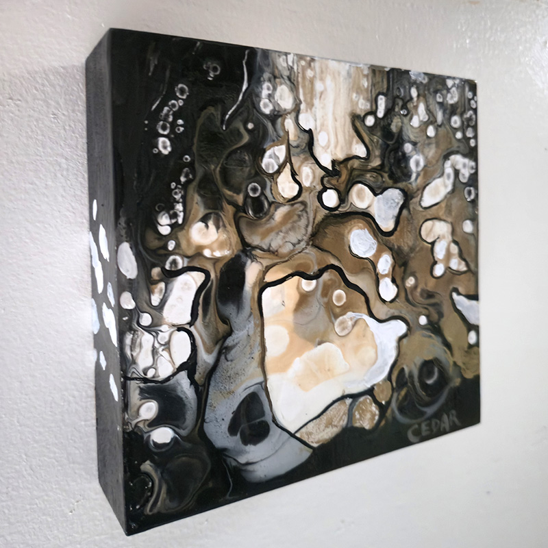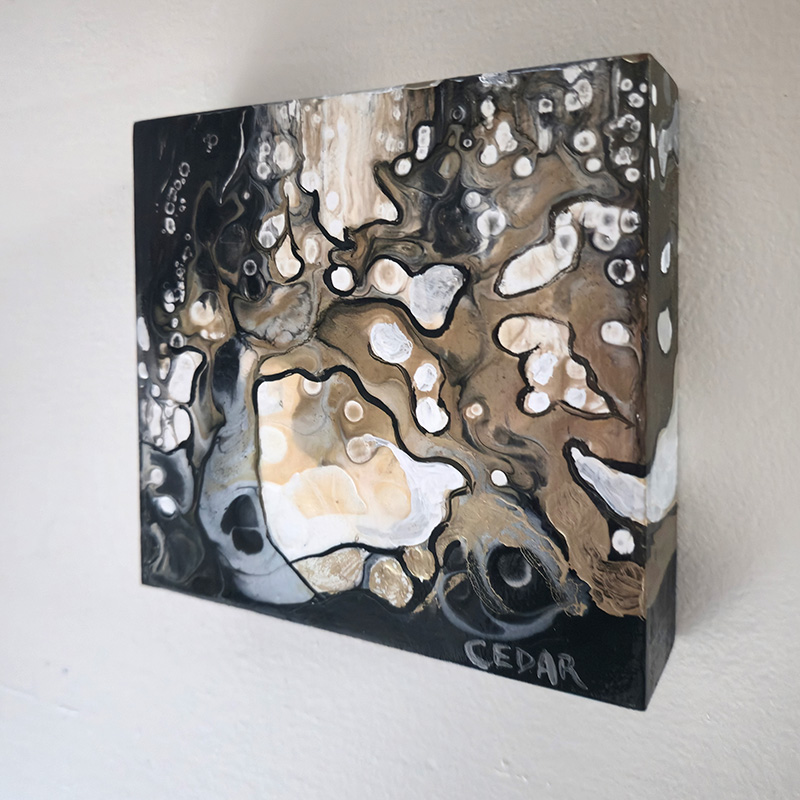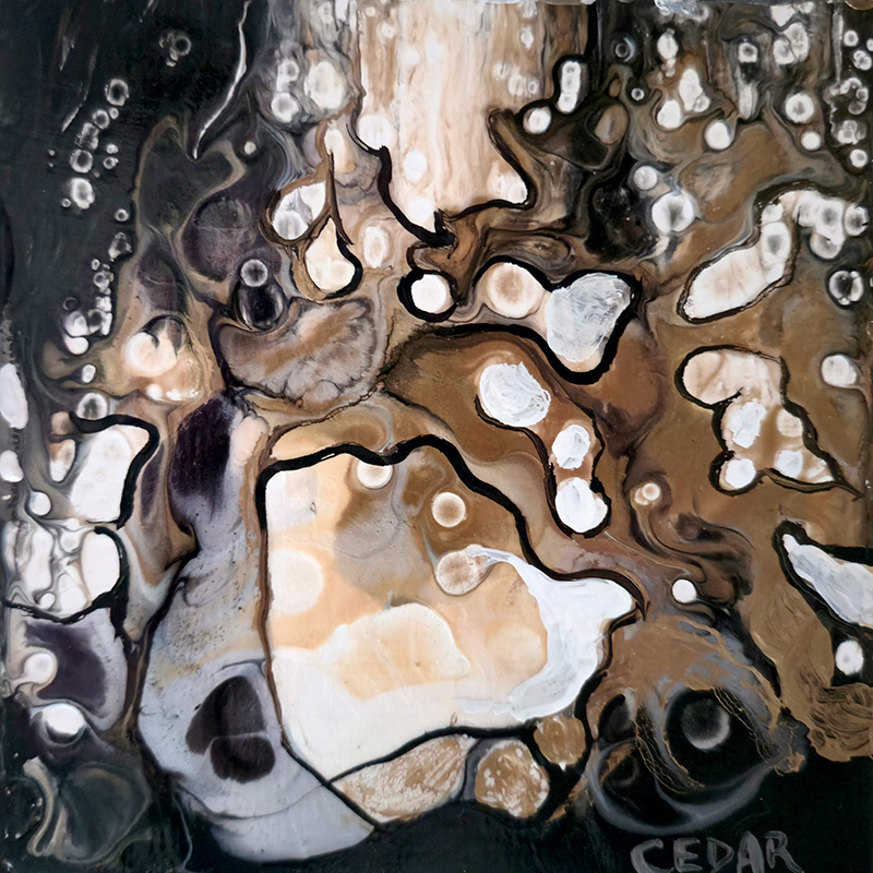 This focus of this painting is on the overlapping shapes, and the way the light golden colors glow alongside the more muted bronze and black.