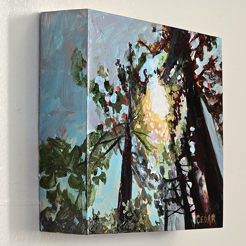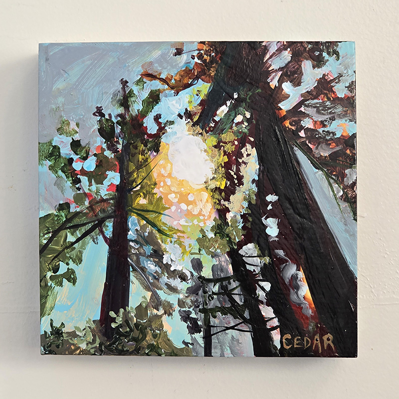 Study of Sun and Redwoods. 6″ x 6″, Acrylic on Wood, © 2025 Cedar Lee