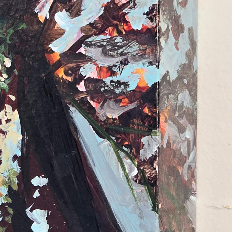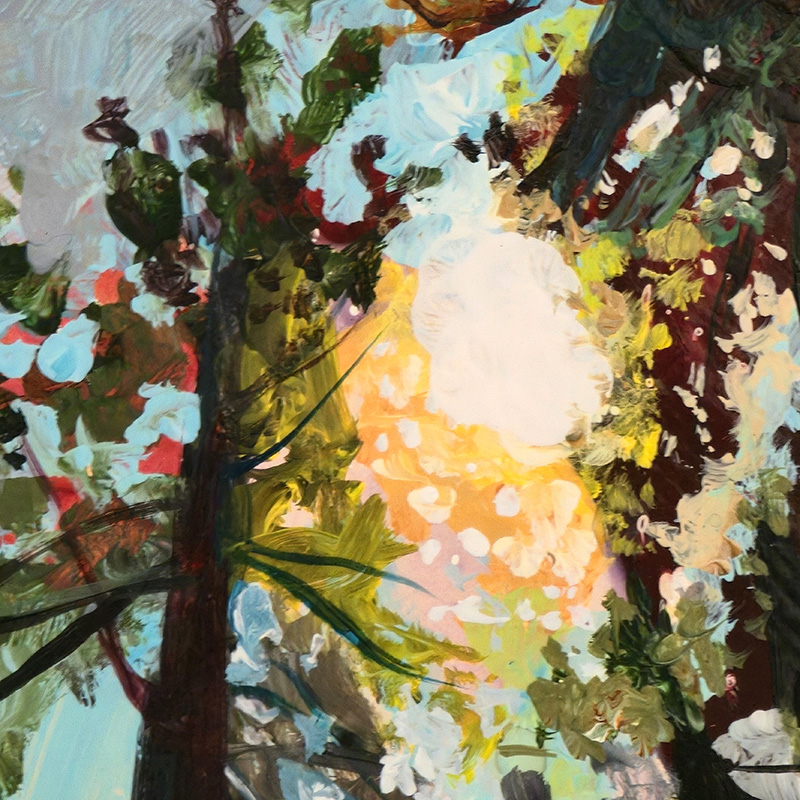It is a painting of redwood trees backlit by a brilliant yellow sun, but you can really feel that it is just as much about the process of painting itself.