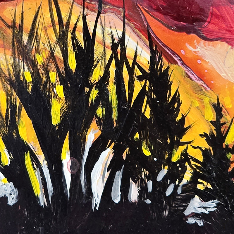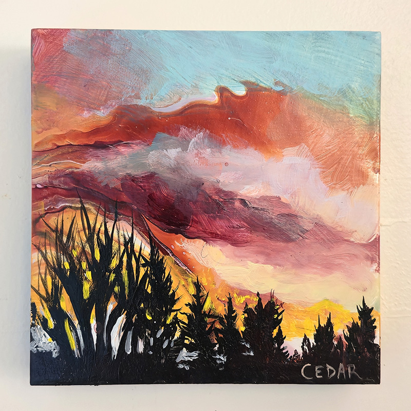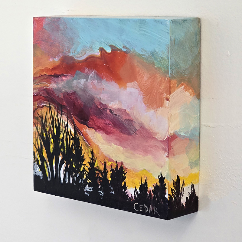 This colorful mini painting, “Wild Sunset,” is inspired by Portland, Oregon’s nature scenes.