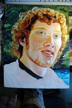 People sometimes ask me about my painting techniques. With portraits, I usually start with a pencil drawing on the canvas to guide me. Then…I just paint. There is really no secret to how it works…I mix the paint with my brush, sometimes on the palette and sometimes directly on the canvas, and bit by bit I apply color, look, and adjust until it’s right. I vary the size of the brush depending on the area I’m covering and how much detail I want. Sometimes I start by blocking out big areas of color immediately then gradually making the details more specific. Lately I have been jumping right into the details from the beginning, starting with the eyes. I feel like the eyes are hard to get just right, and they’re also the most important part of a person’s face…so if I can nail the eyes at the beginning then it’s all downhill from there. The eyes, in my opinion, truly make or break a portrait.